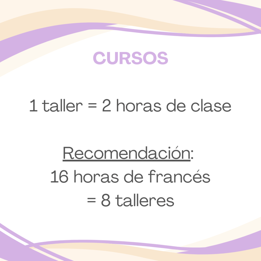 En cada sesión, el objetivo es tener una primera lección/explicación de gramática. La segunda parte es un rápido ejercicio escrito, seguido de una tercera y última parte de aplicación oral de los nuevos conceptos aprendidos. En los talleres se da prioridad al trabajo oral.